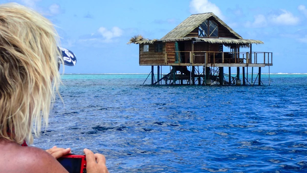 The actual farm is in the lagoon covering a large coral garden where the oysters are cultivated, with the workshop/shop being a small, over-the-water structure sitting all by itself. The visits are by appointment only, and Summer picked us up in the big farm skiff and shuttled us to the workshop.