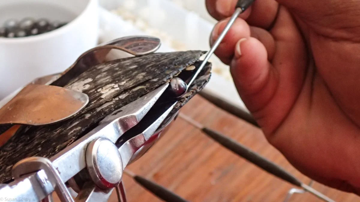 What an interesting tour! She explained exactly how the pearls are cultivated and Reno demonstrated how it is done. Such precision! He used dental tools to extract the pearl or insert a new nucleus into a virgin oyster. Bowls of pearls of all sizes gleamed, the multiple colors from rose through greens and golds showing that black pearls really aren't always black!