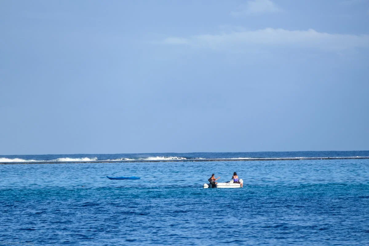 All hands on deck! Dropping the mooring we headed back up the channel and while Betsy held the Hoku Lele in a wide part of the channel, Jane and Laura jumped in the dinghy and carefully set off across the very shallow coral to retrieve the wayward kayak. As they neared it, as it got closer and closer to the pass, Laura swam to it, with the paddle, climbed aboard and started back to the mother ship. A great cheer went up! What an achievement!