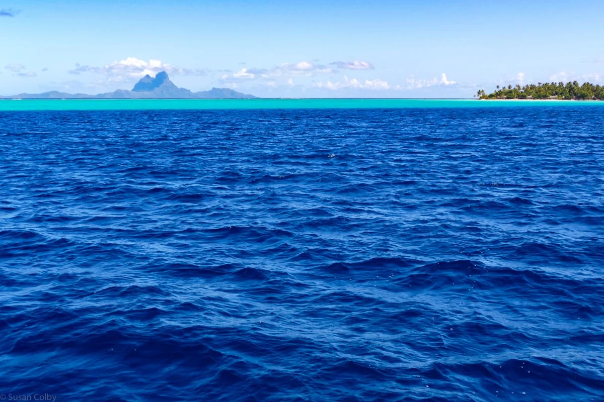 Once again, navigating carefully by water color, with additional lookouts on the bow, we made our way out of Baie Hurepiti to head north inside the reef. The Le Taha'a Resort and Spa is on Motu Tautau and the overwater bungalows are visible from quite a way off, while off in the distance, Bora Bora's distinctive profile rose up from the cerulean sea.