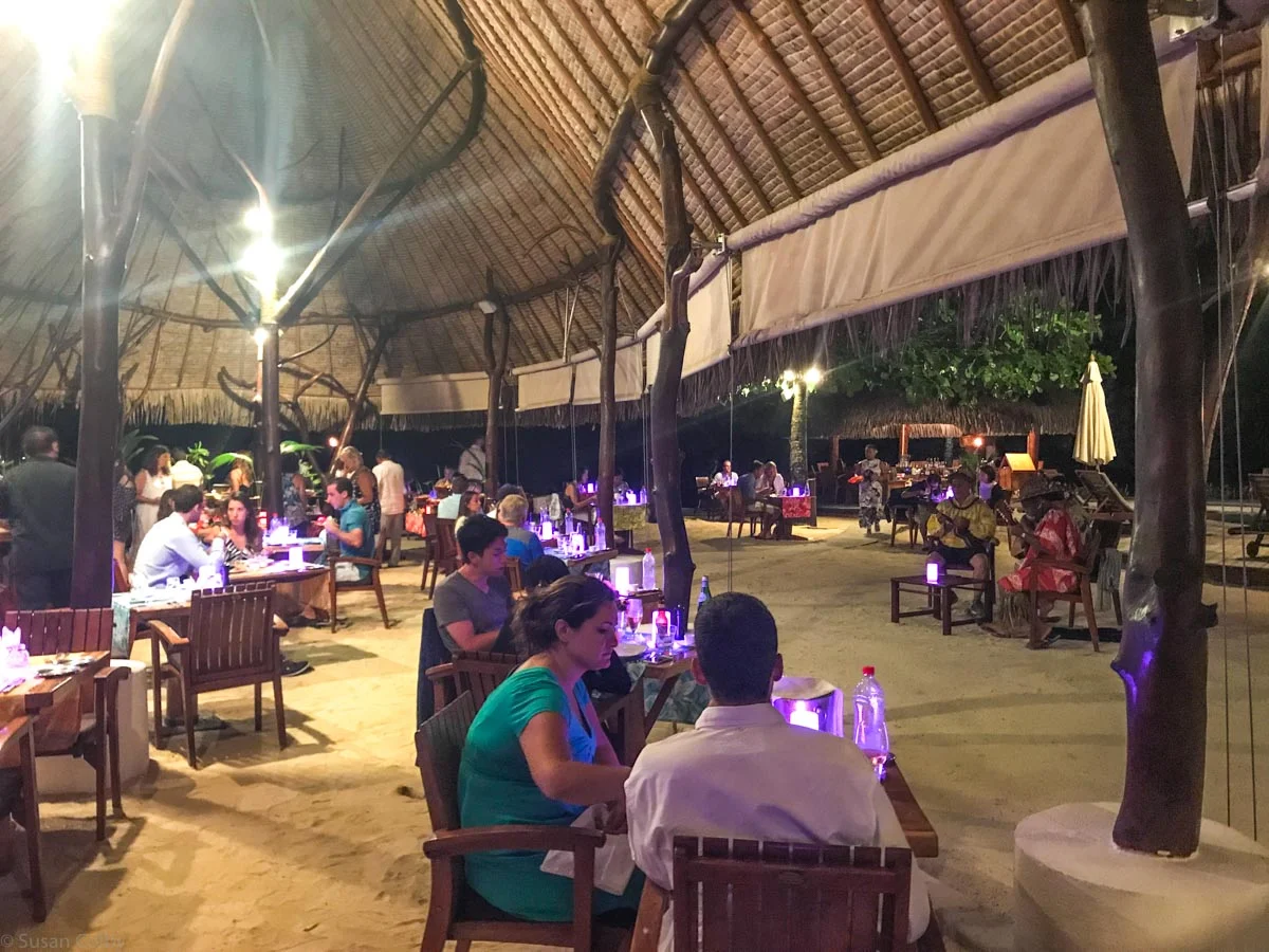 That evening, we had reservations at the Resort for dinner. It was pitch black when we left the boat and dinghyed slowly to the resort's dock, trying to stay dry. We were assisted ashore by the dock master and directed to our restaurant, one of three at the resort, and apparently the only one open to non-registered guests. The Resort itself is beautiful with meticulously-maintained grounds and Tahitian-style architecture. Raised wooden walkways wind among the palm trees, lit with strategically-place lights. We followed the path to the restaurant and found our table in the palm thatched, open-air restaurant. A Tahitian trio entertained us while we selected our food from a vast array of dishes served buffet-style. Although it was a very expensive dinner, it was worth being able to visit the resort and see how the one-percenters live.